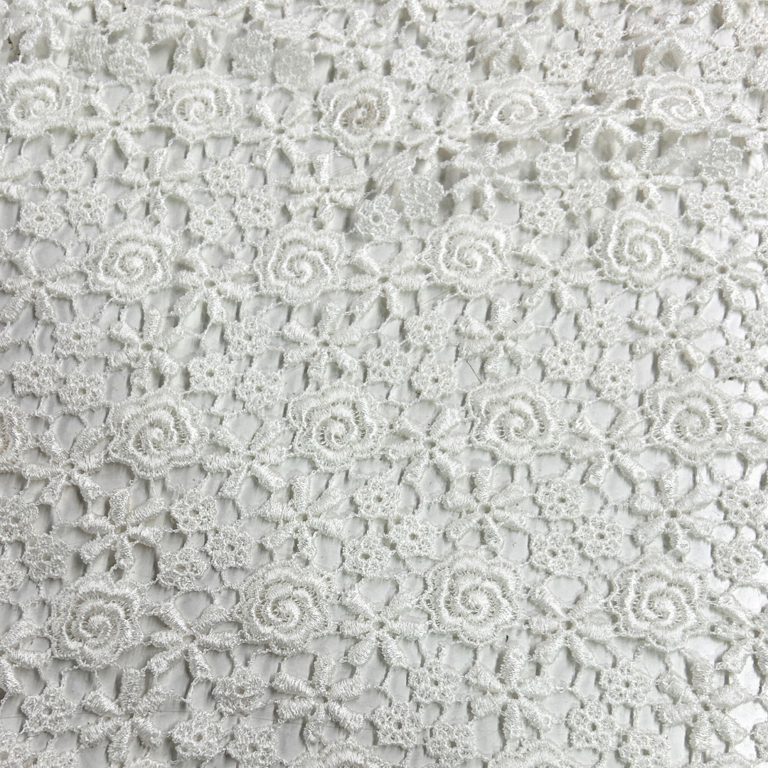 La tela guipure es sinónimo de sofisticación y distinción en el mundo de la moda. Con su intrincado diseño de encaje sin fondo, esta tela transforma cualquier prenda en una obra maestra de elegancia. Sus patrones ornamentales y detalles exquisitos aportan un aire de lujo, ideal para crear vestidos de gala, trajes de novia y blusas sofisticadas. La textura ligera y la estructura a base de hilos entrelazados ofrecen una apariencia etérea que capta miradas y realza cada diseño con un toque de refinamiento único.
