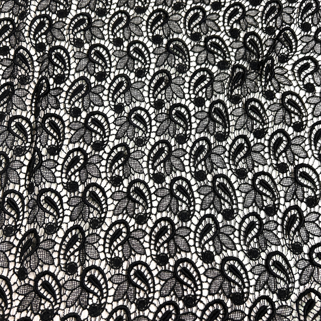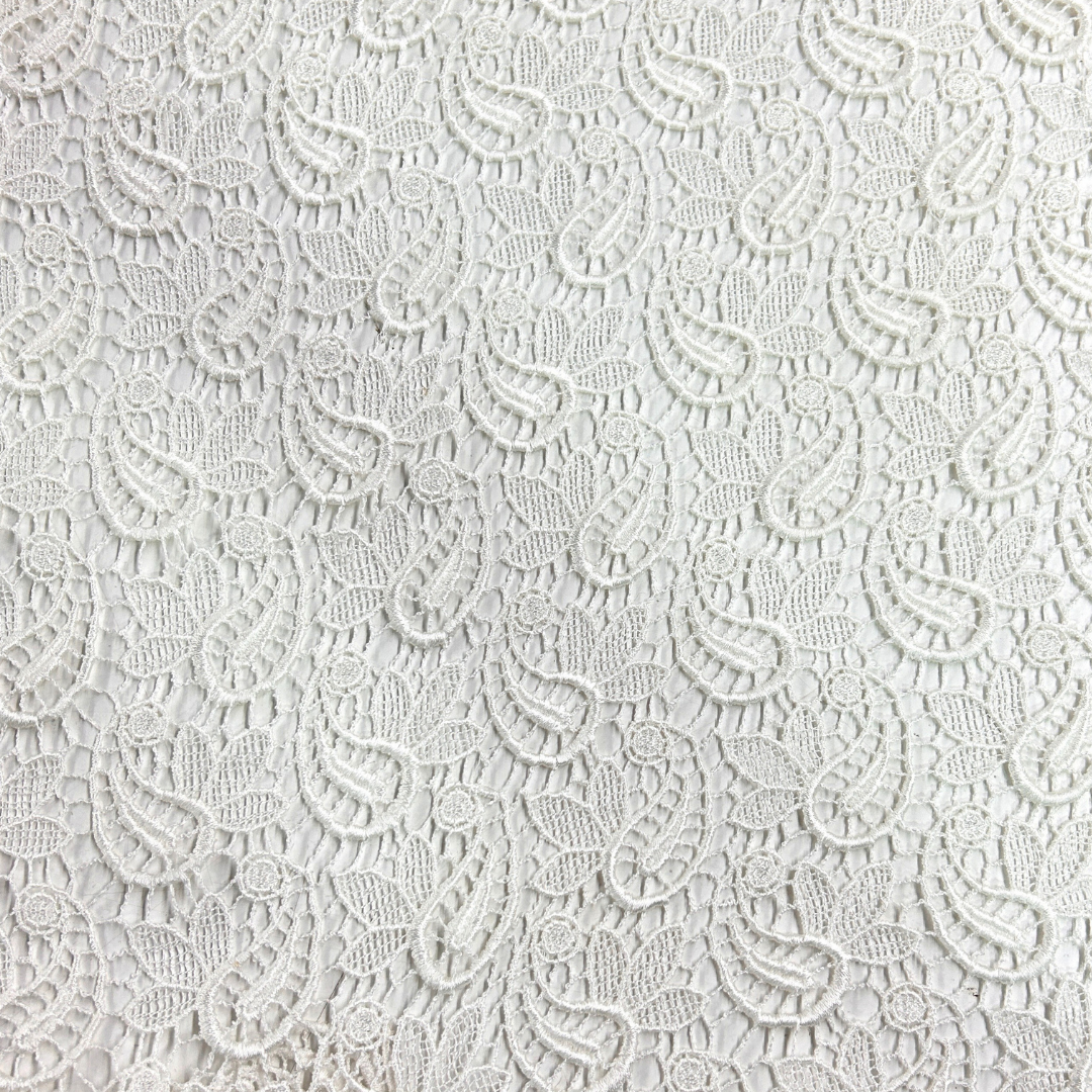 La tela guipure es sinónimo de sofisticación y distinción en el mundo de la moda. Con su intrincado diseño de encaje sin fondo, esta tela transforma cualquier prenda en una obra maestra de elegancia. Sus patrones ornamentales y detalles exquisitos aportan un aire de lujo, ideal para crear vestidos de gala, trajes de novia y blusas sofisticadas. La textura ligera y la estructura a base de hilos entrelazados ofrecen una apariencia etérea que capta miradas y realza cada diseño con un toque de refinamiento único.