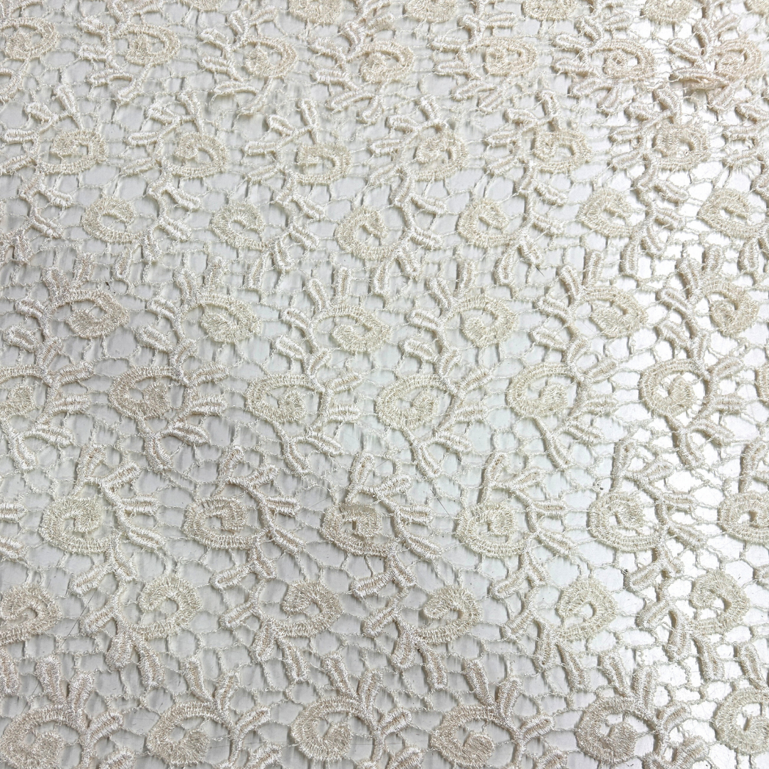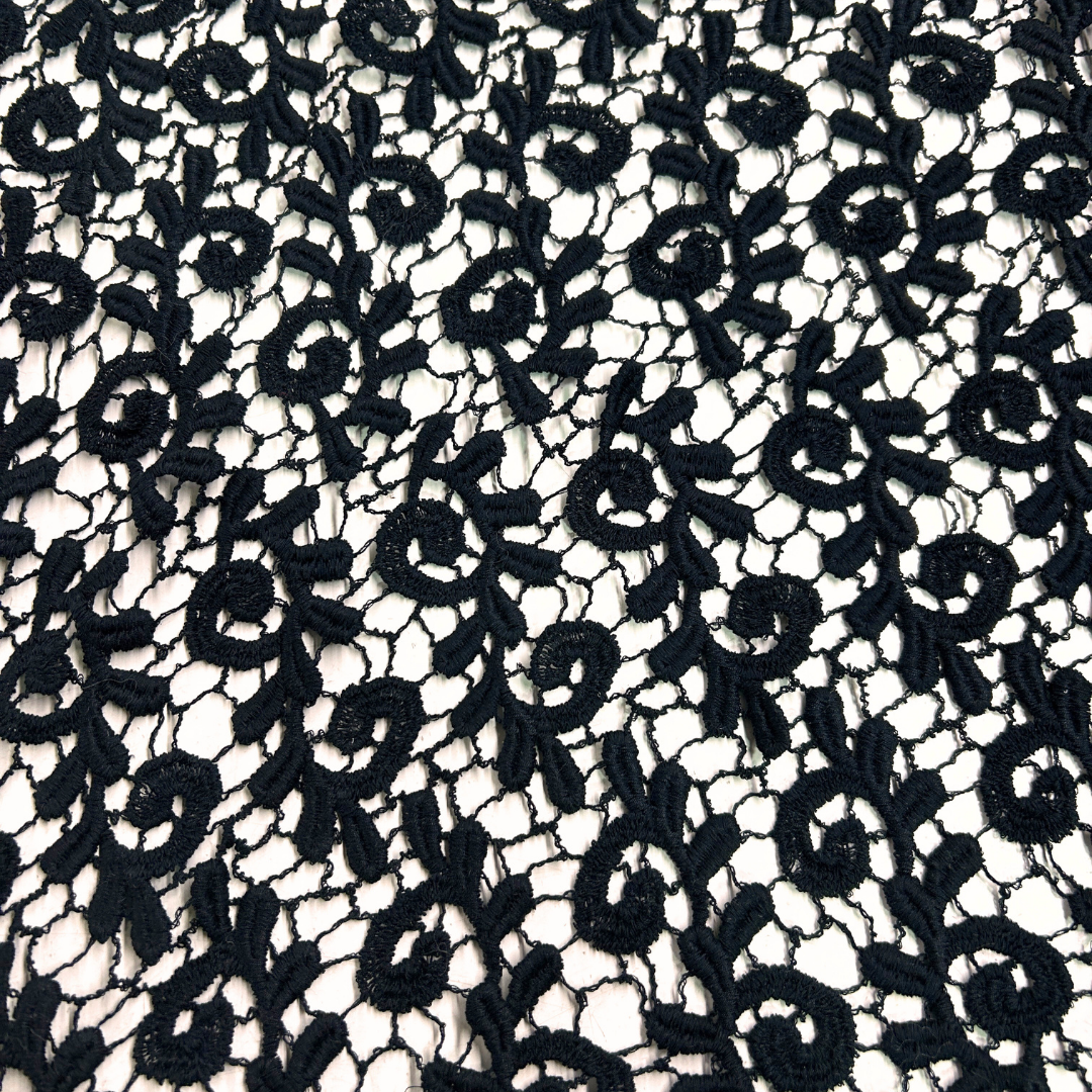 La tela guipure es sinónimo de sofisticación y distinción en el mundo de la moda. Con su intrincado diseño de encaje sin fondo, esta tela transforma cualquier prenda en una obra maestra de elegancia. Sus patrones ornamentales y detalles exquisitos aportan un aire de lujo, ideal para crear vestidos de gala, trajes de novia y blusas sofisticadas. La textura ligera y la estructura a base de hilos entrelazados ofrecen una apariencia etérea que capta miradas y realza cada diseño con un toque de refinamiento único.