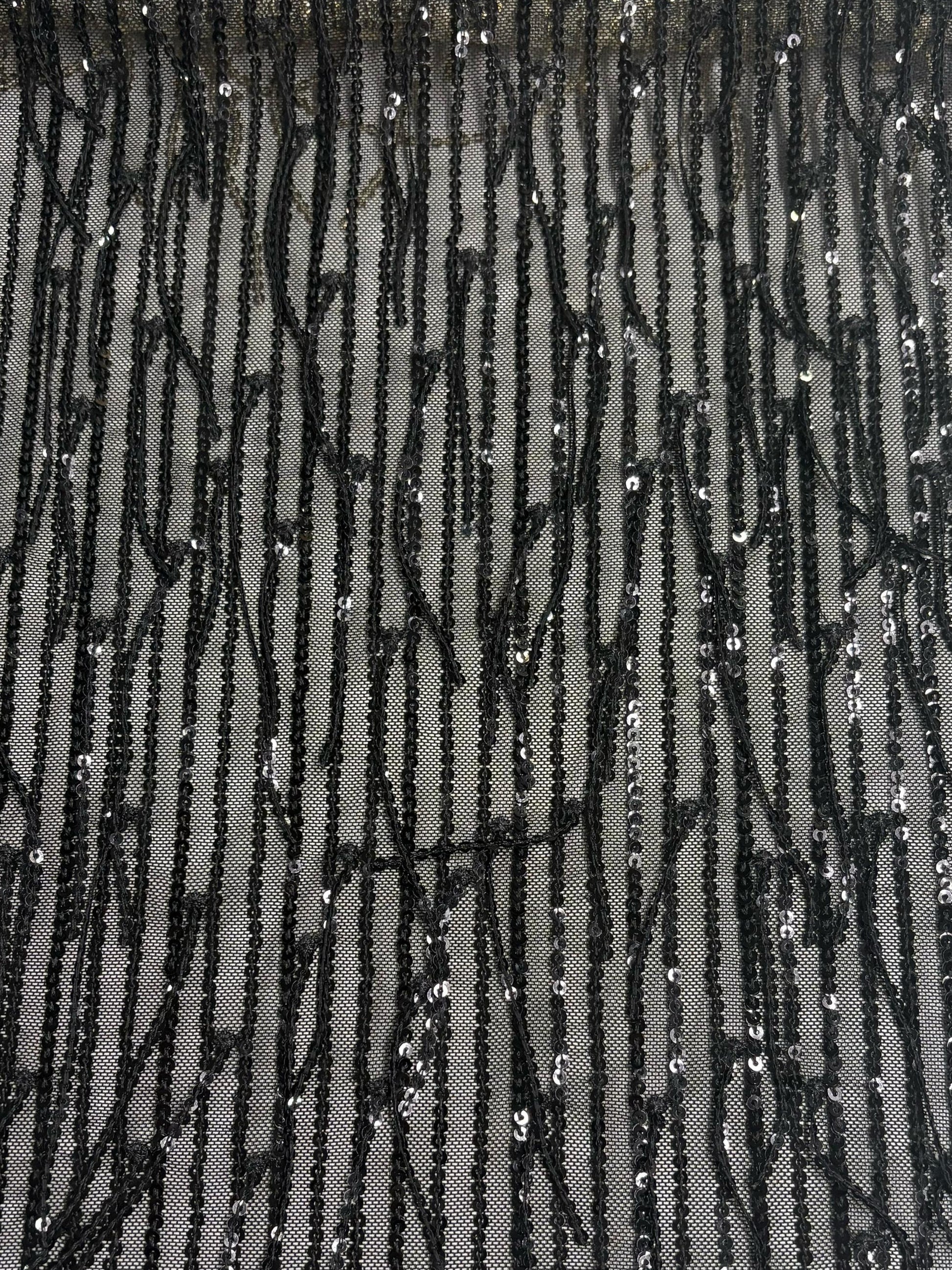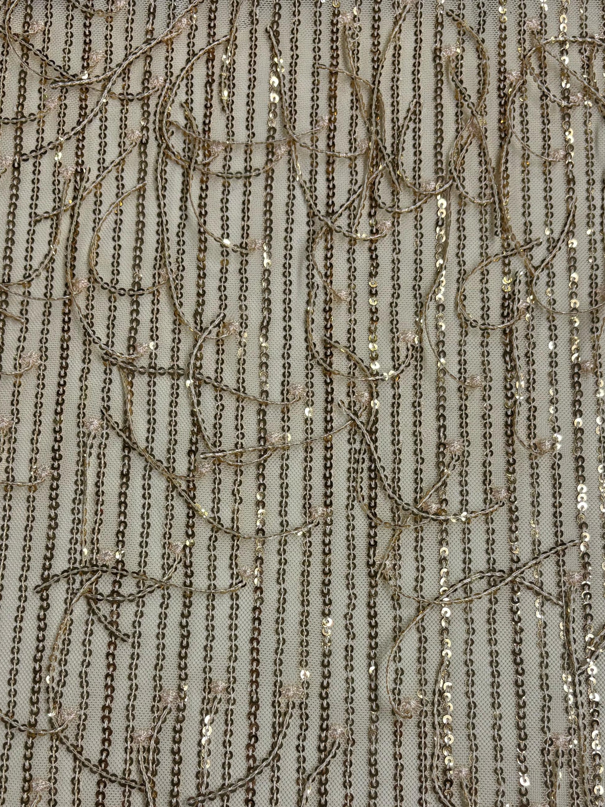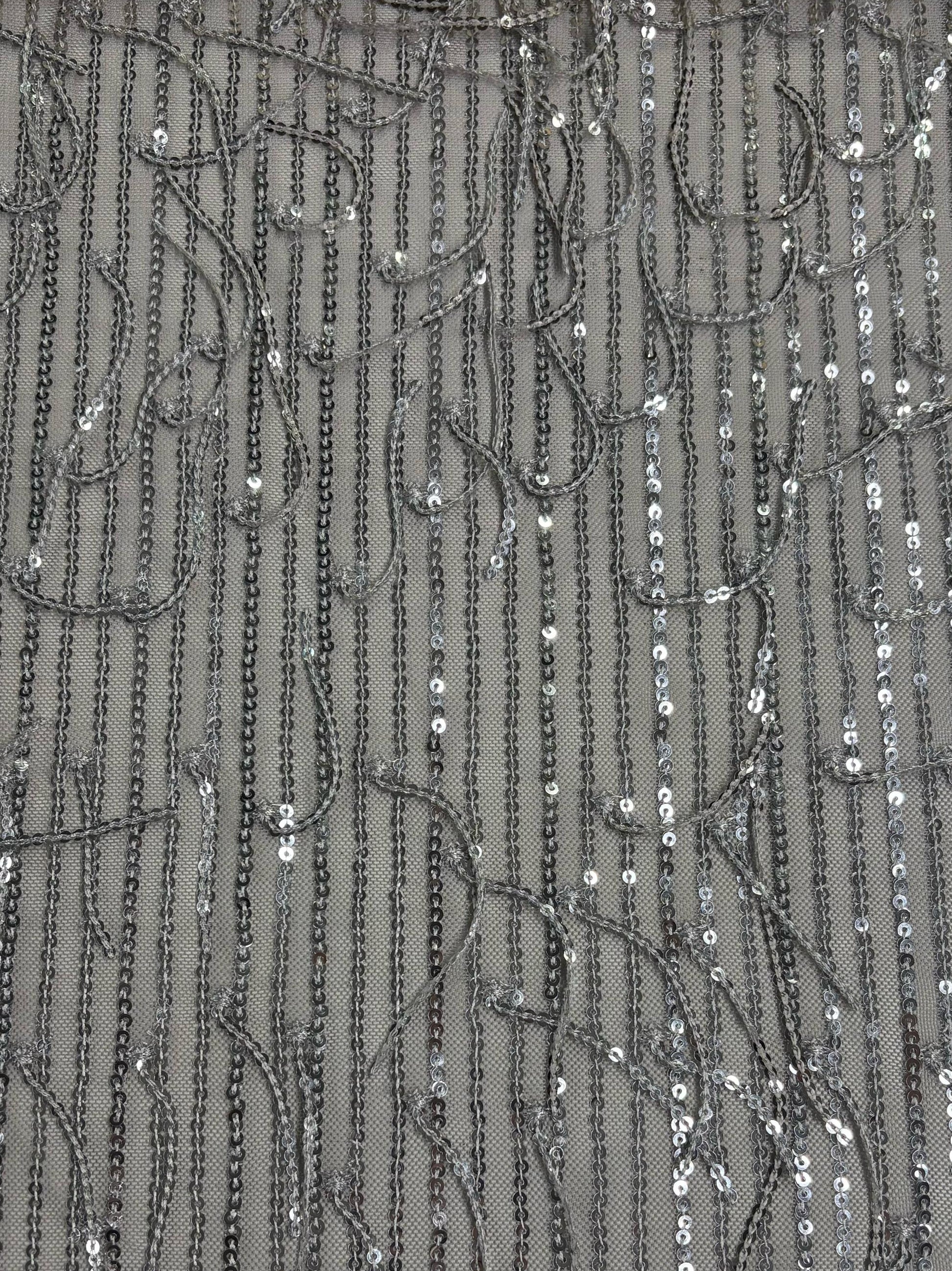 Este tul combina elegancia y dinamismo al incorporar lentejuelas dispuestas en líneas verticales junto con delicados flecos que aportan movimiento y fluidez. Las lentejuelas alineadas crean un efecto de elongación y sofisticación, mientras que los flecos añaden un toque de ligereza y gracia al diseño, balanceando la estructura con un aire de frescura. Esta combinación es ideal para vestidos de noche o conjuntos de alta costura, logrando un look moderno y elegante que se mueve con suavidad y estilo al ritmo del cuerpo.