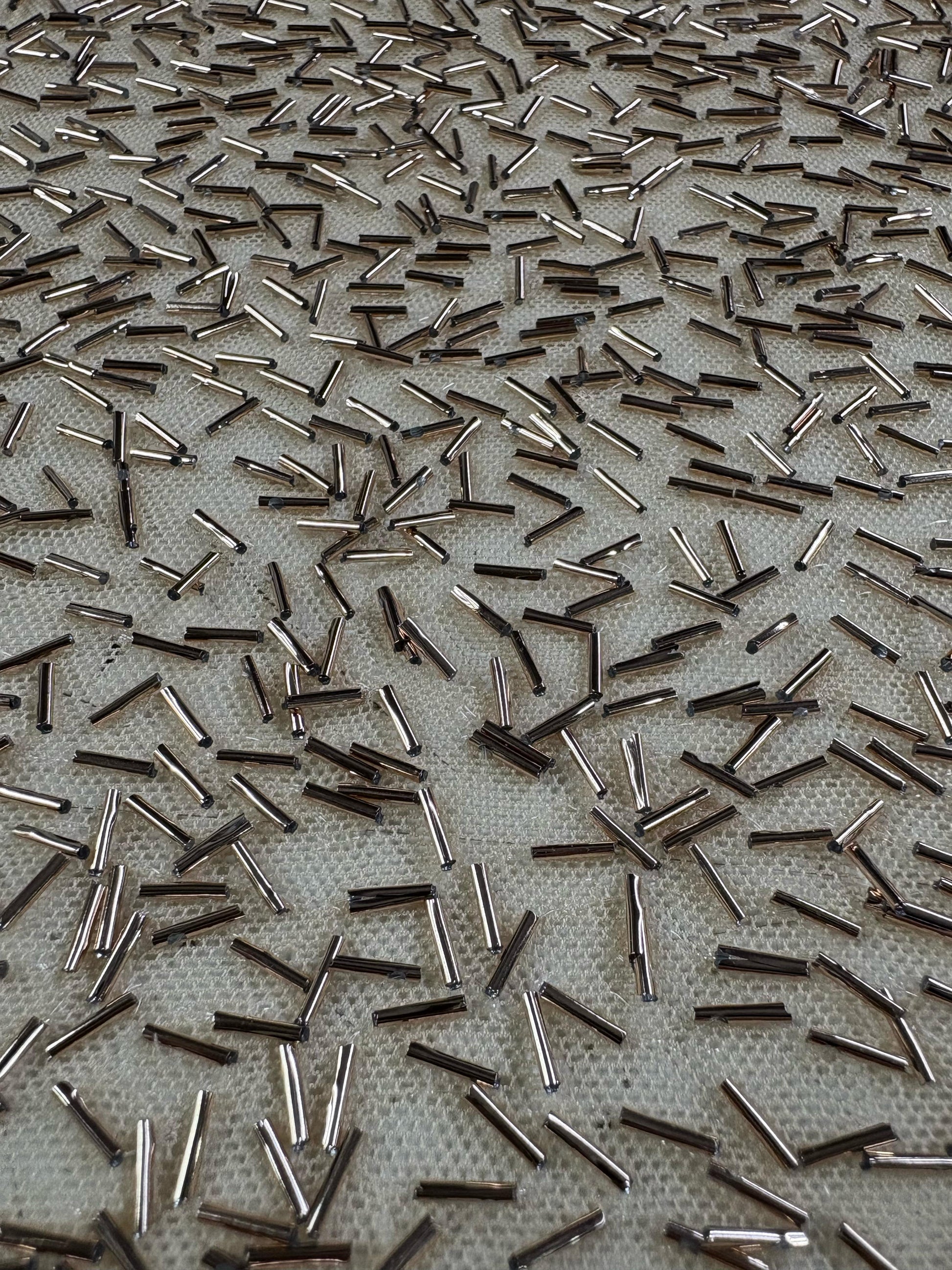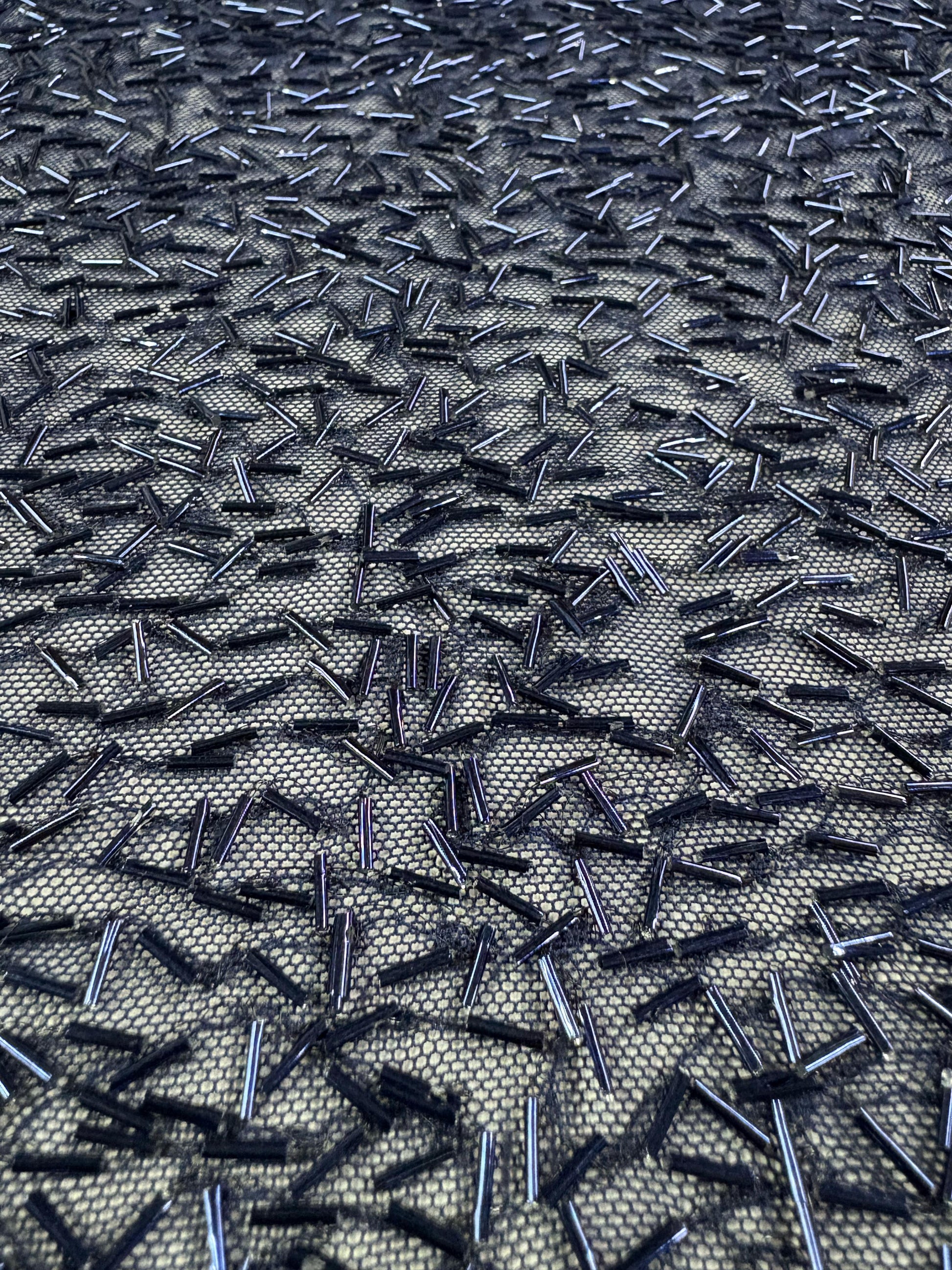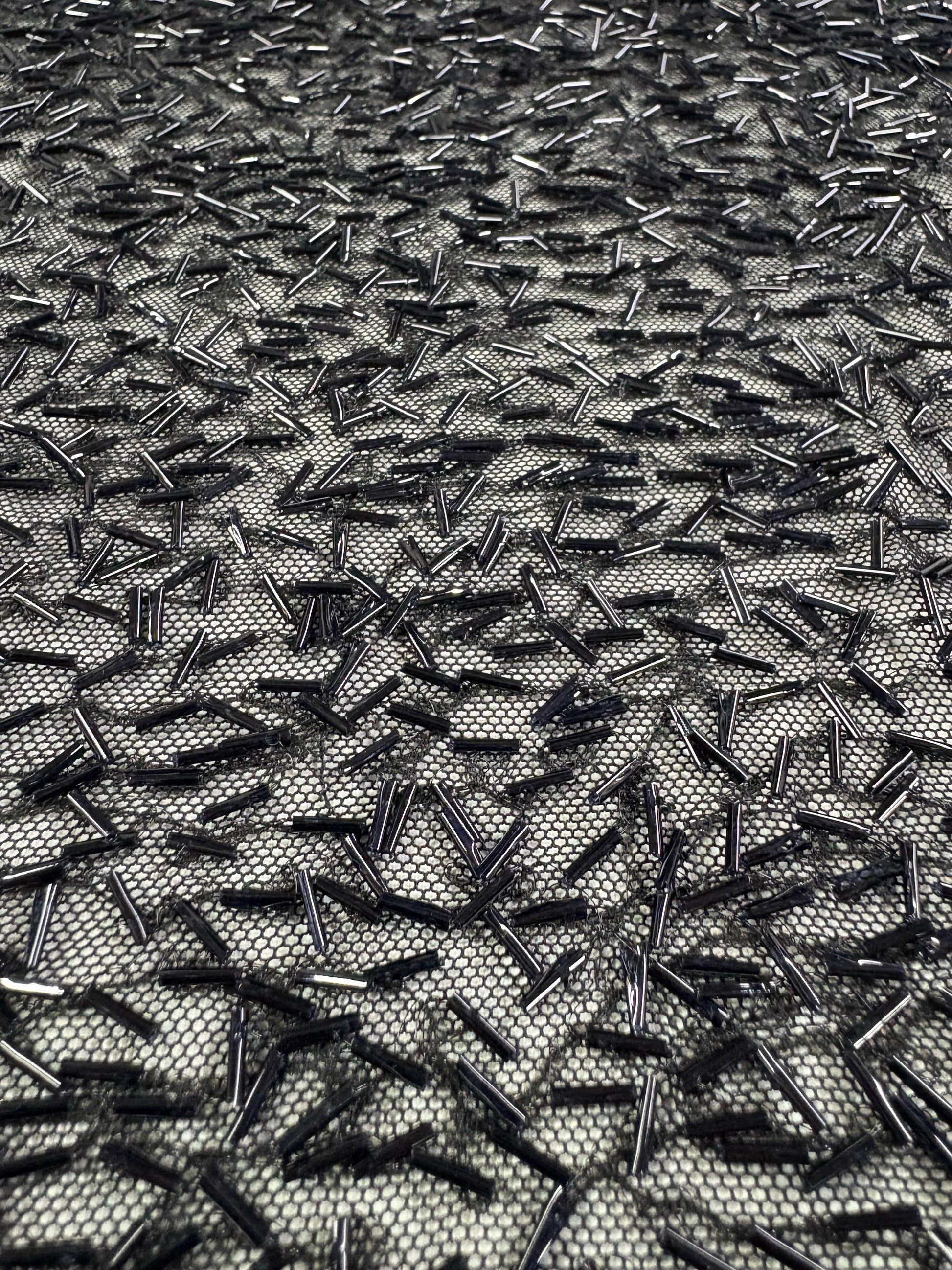 Este tul delicado presenta una base de malla transparente de textura sutil y suave. Está adornado con apliques de cuentas metálicas alargadas en forma de tubos brillantes, dispuestas de manera asimétrica para crear un efecto visual dinámico y cautivador. La disposición aleatoria de los elementos metálicos aporta movimiento y un aire de modernidad, mientras que su acabado pulido refleja la luz con elegancia, añadiendo un toque de lujo contemporáneo. Perfecto para prendas de alta costura, vestidos de noche o detalles decorativos que buscan combinar sofisticación y vanguardia.