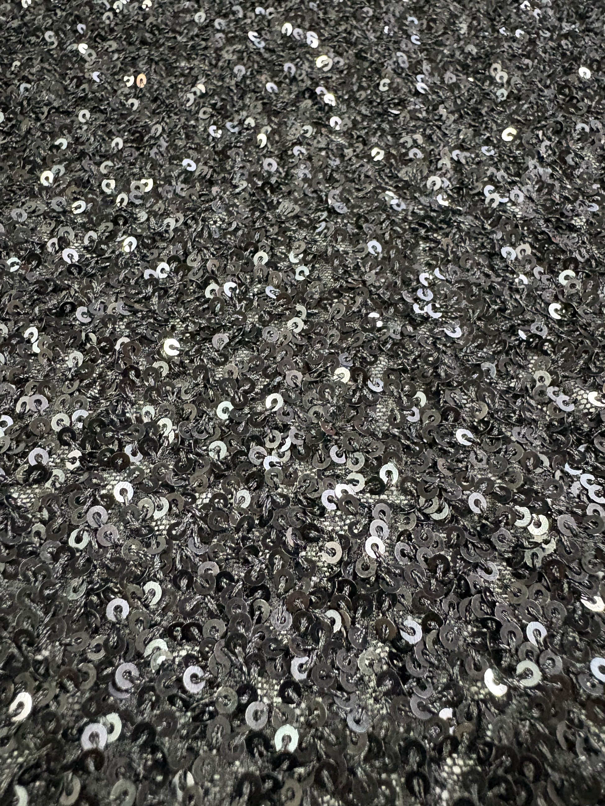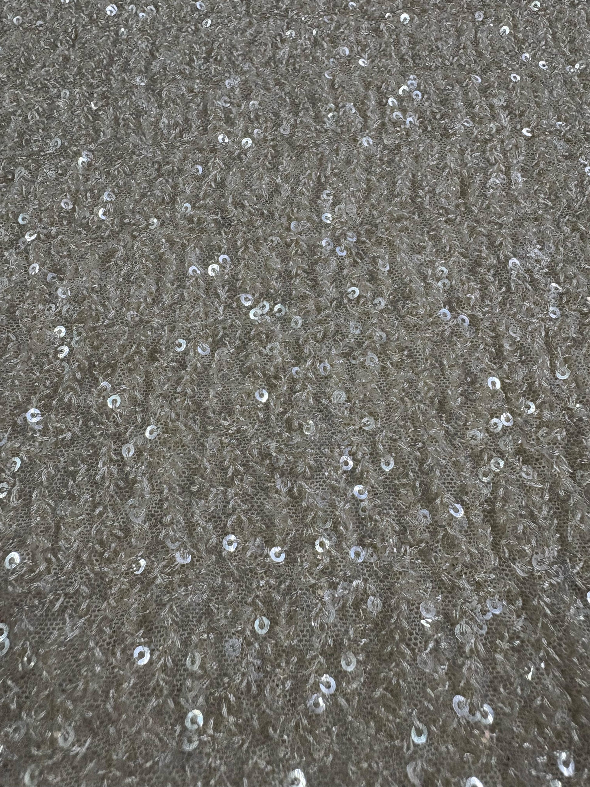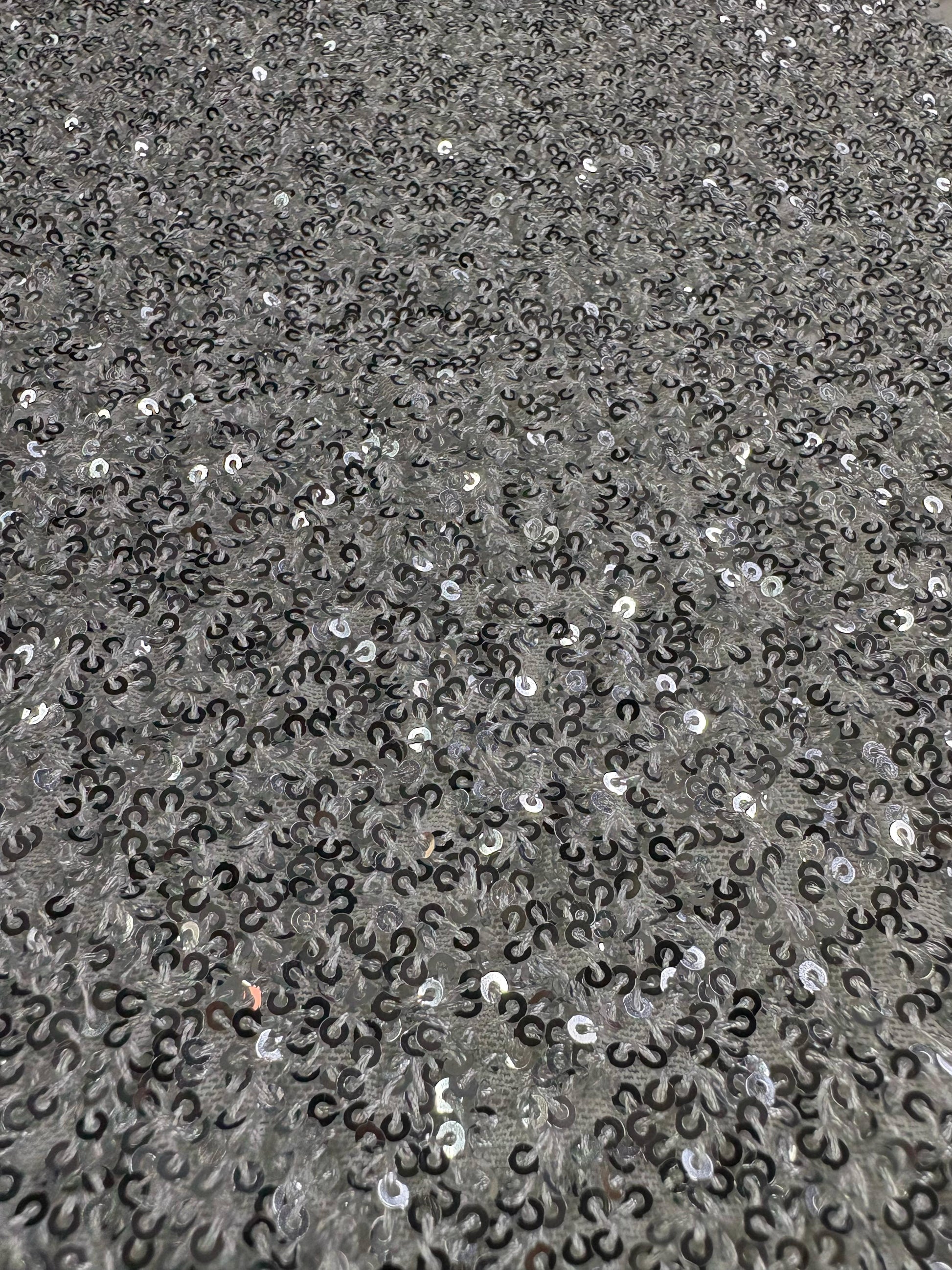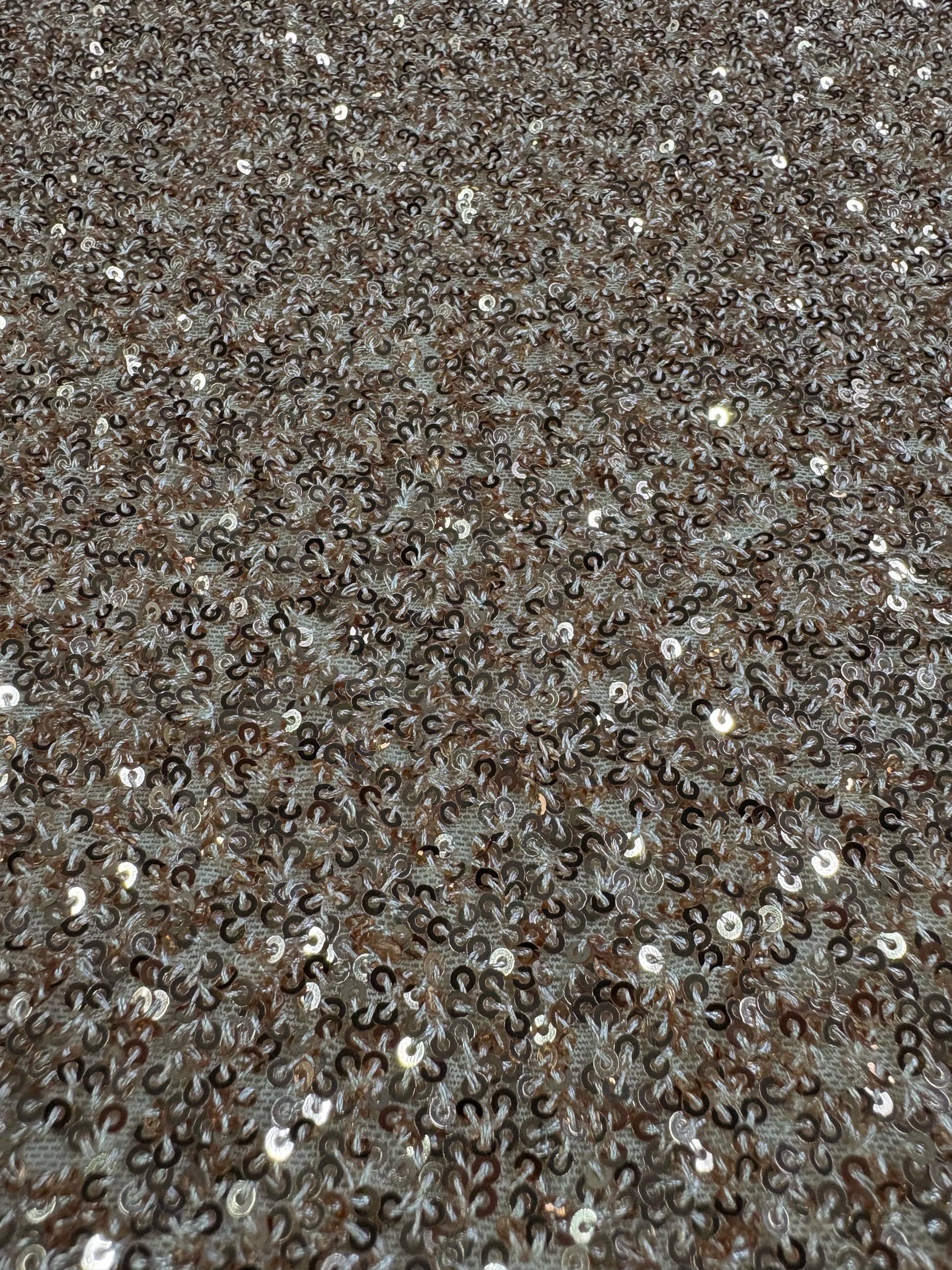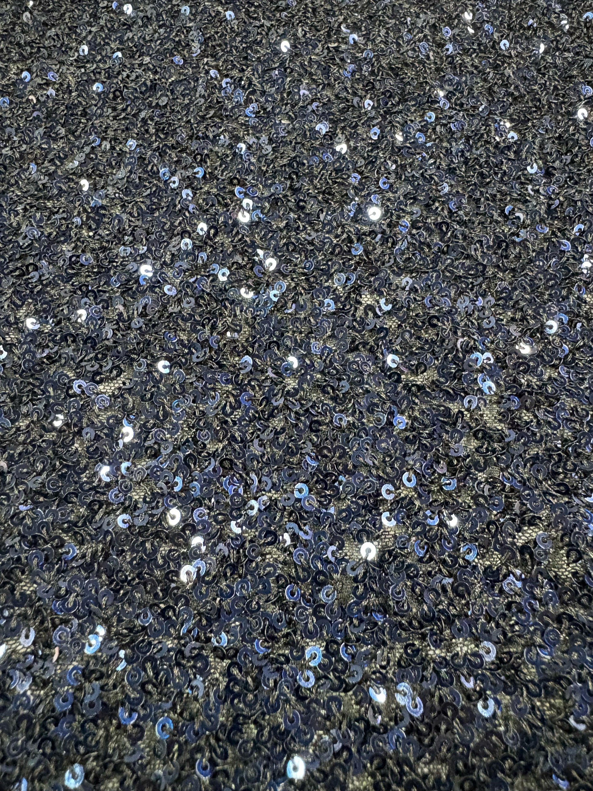 Este tul presenta una base de malla delicada y flexible, completamente cubierta de lentejuelas en forma de media luna. Las lentejuelas están dispuestas de manera densa y uniforme, creando un efecto de brillo continuo y envolvente. La disposición cercana de los apliques permite que reflejen la luz desde múltiples ángulos, logrando un resplandor dinámico y sofisticado. El patrón curvo de las lentejuelas aporta una sensación de movimiento y fluidez al diseño, añadiendo textura y profundidad visual. Este tul es ideal para confeccionar vestidos elegantes, trajes de noche o prendas que busquen un impacto visual glamoroso y sofisticado.